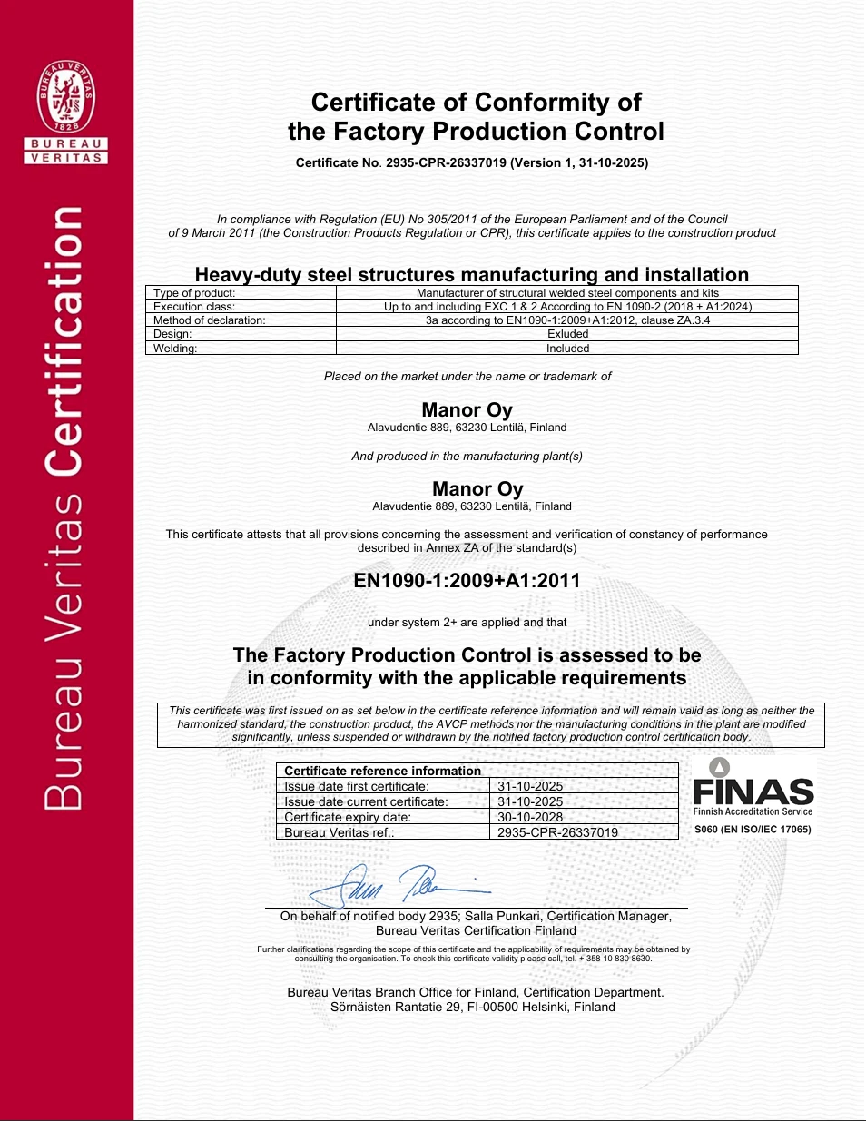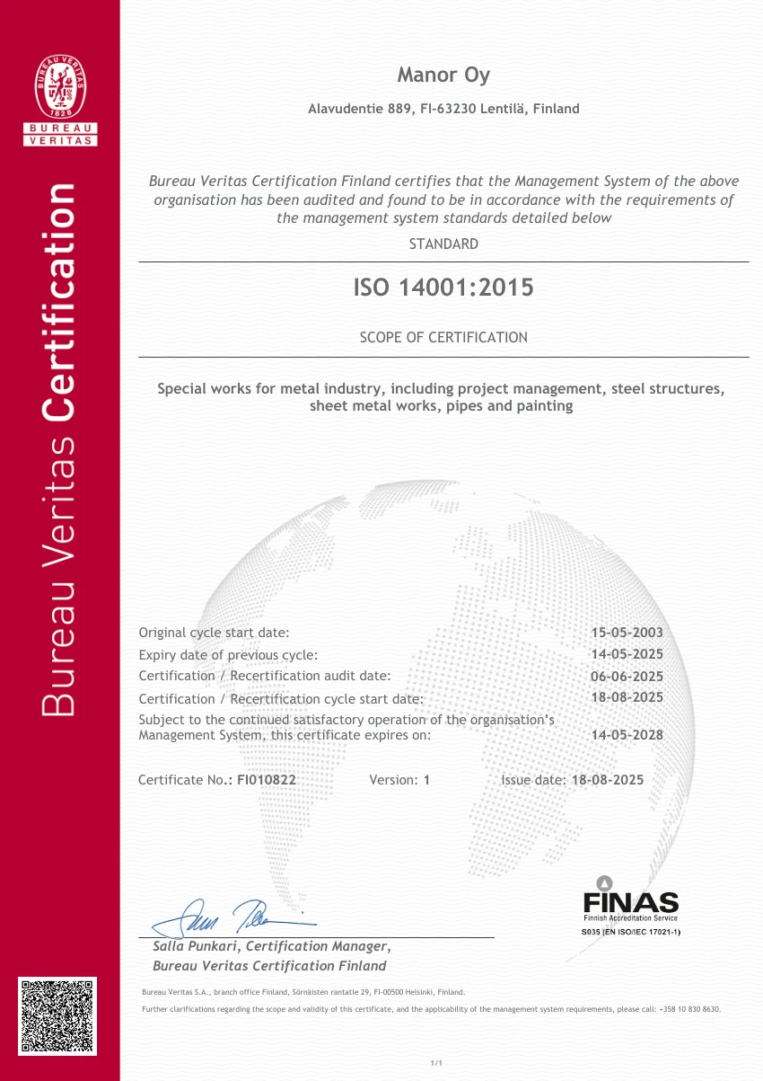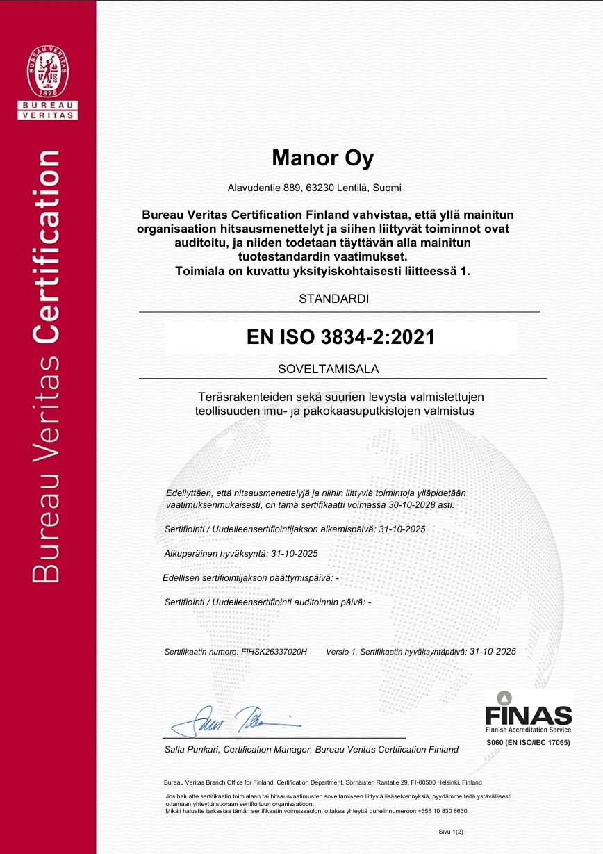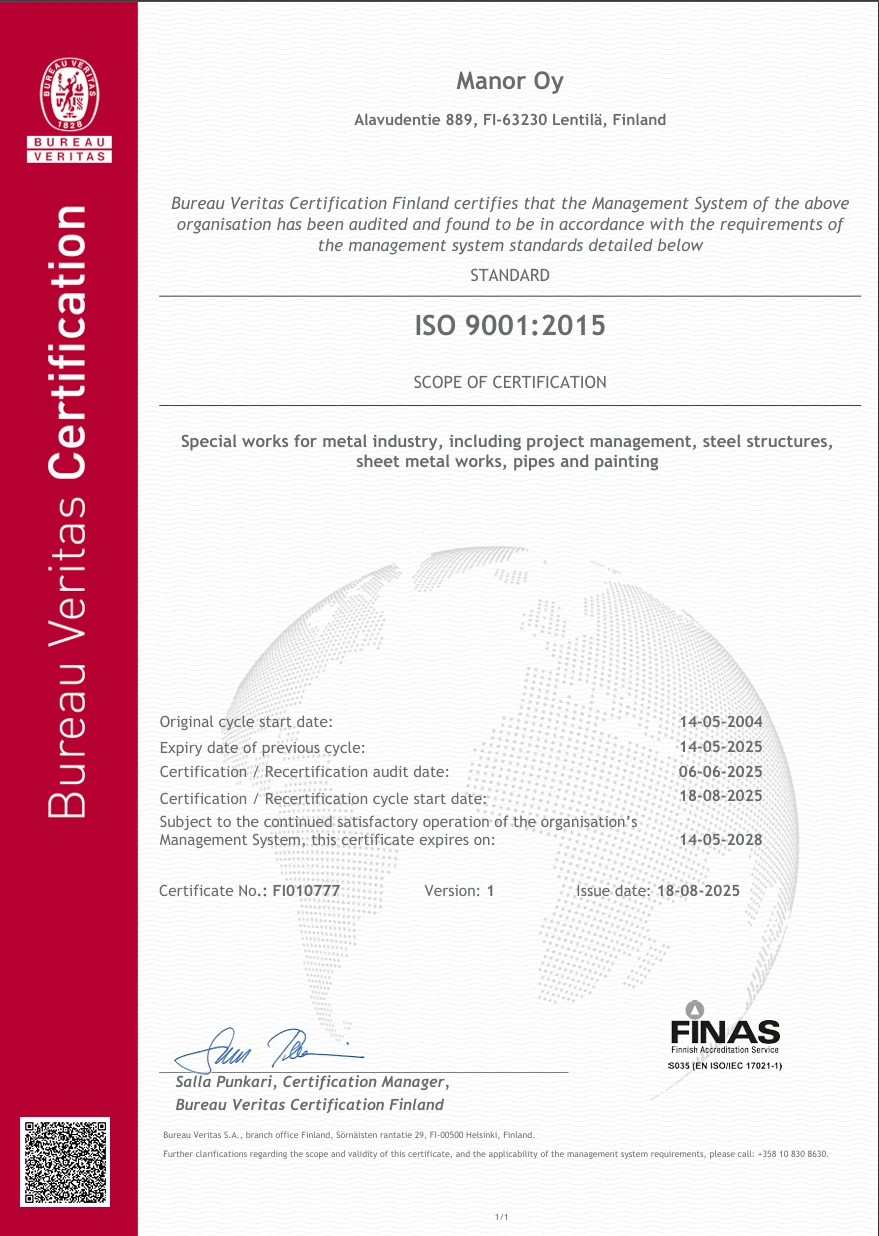 Vårt verksamhetssystem är certifierat enligt standarderna SFS-EN ISO 9001:2008 och SFS-EN ISO 14001:2004 samt SFS-EN ISO 1090-2+A1 / EN 3834. Våra svetsare har svetsklasserna i kraft i enlighet med standarden EN 287-1. Manor Ab eftersträvar aktiv miljövård och iakttar de miljökrav som ställs på företag. Vi följer principerna för aktivt miljöarbete alltid då det är tekniskt och ekonomiskt möjligt.